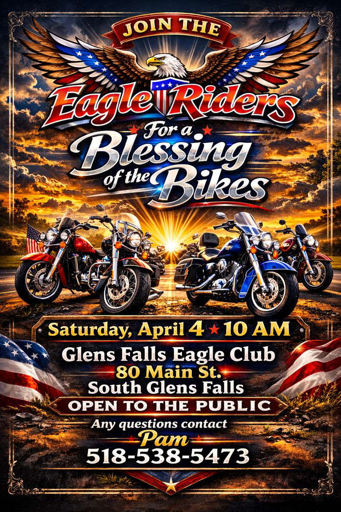 Glen Falls Eagle Riders will host a Blessing of the Bikes on Saturday April 4th at 10am at 80 Main St. in South Glens Falls.